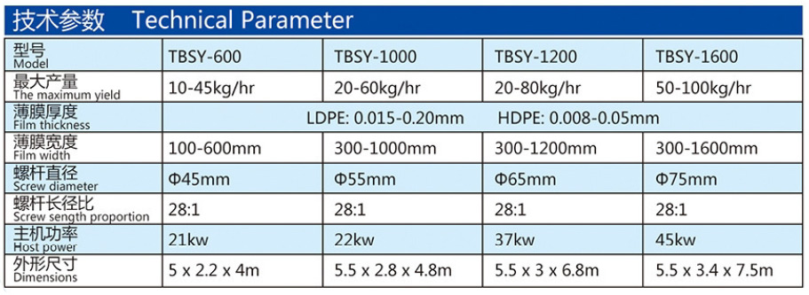 吹制各種規(guī)格的低密度聚乙烯、高密度聚乙烯和線性低密度聚乙烯塑料薄膜,廣泛應(yīng)用于食品百貨、日用、化工、針紡品、購(gòu)物禮袋和工業(yè)包裝。機(jī)簡(jiǎn)、螺桿采用38CrMoAl合金材料經(jīng)氮化處理精密加工而成,具有很好的耐磨和耐腐蝕性。