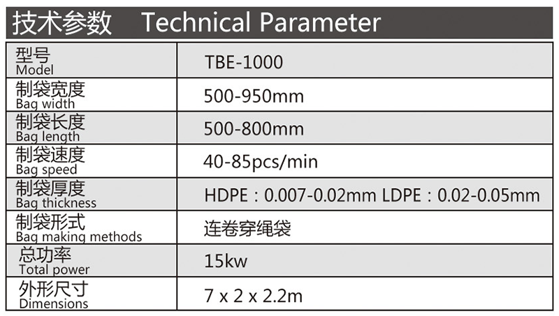 機(jī)器特性 此設(shè)備為生產(chǎn)連卷穿繩袋的專用設(shè)備,制袋速度快,調(diào)節(jié)簡單。此設(shè)備采用全鋼板一體而成,用電220v照明電即可。